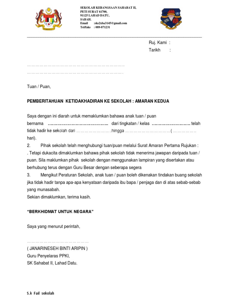 Surat Amaran Ketidakhadiran Ke Sekolah