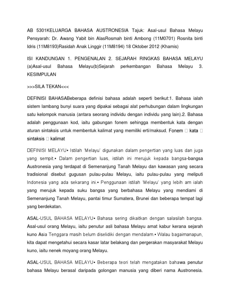 Perbandingan bahasa melayu dengan bahasa bahasa jenis sarawak. Bahasa dalam konteks geografi dan kekeluargaan bab 1. Perkaitan bahasa melayu dengan bahasa bahasa dalam rumpun austronesia 3 1. Susur galur bahasa melayu bab 3.